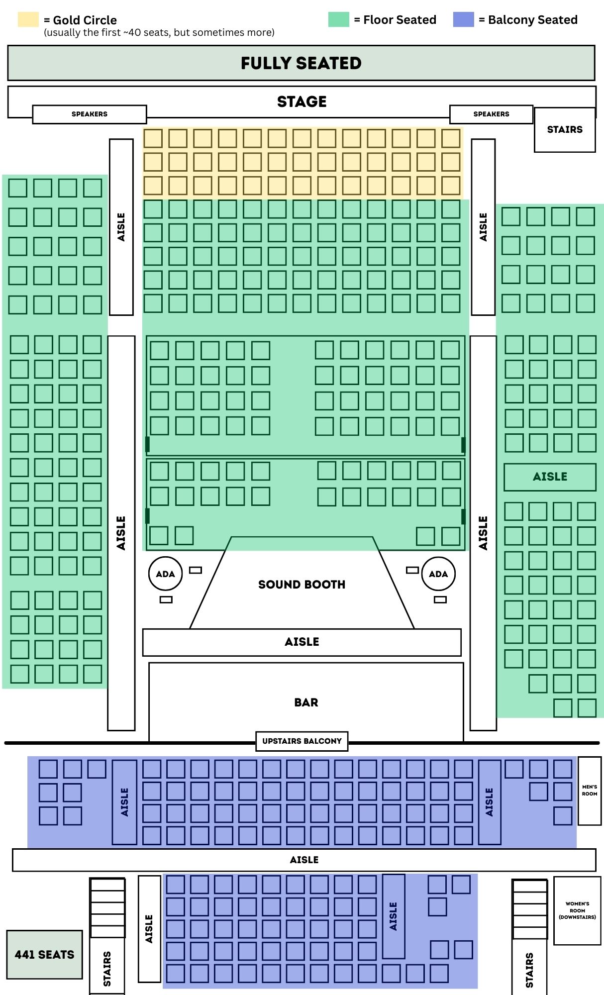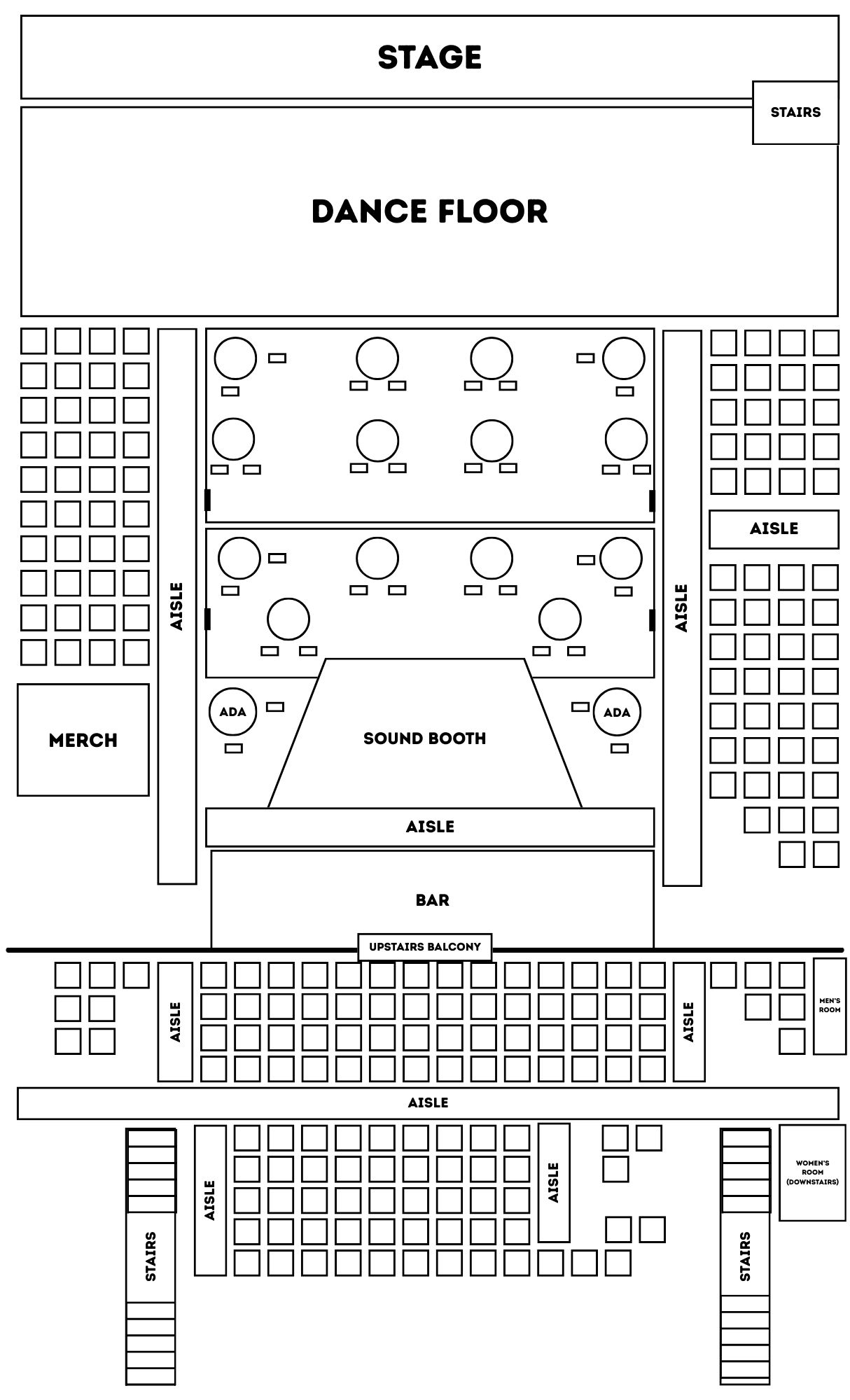 If the show only has General Admission tickets, patrons are able to freely move throughout the venue. If a show has General Admission and Balcony tickets, General Admission is only on the floor, and Balcony allows you to go upstairs. Tickets do not assign you an exact seat, they assign you a seating section. All seats are first come, first served. For Fully Seated shows, scroll down for the Fully Seated map.